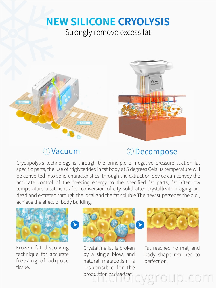 Cryo เป็นวิธีที่ไม่รุกรานใหม่ในการลดไขมันอย่างนุ่มนวลและมีประสิทธิภาพในพื้นที่เป้าหมายของร่างกาย เนื่องจากไตรกลีเซอไรด์ในไขมันจะถูกแปลงเป็นของแข็งโดยเฉพาะอย่างยิ่งอุณหภูมิต่ำมันใช้เทคโนโลยีการระบายความร้อนขั้นสูงเพื่อคัดเลือกนูนของไขมันและกำจัดเซลล์ไขมันผ่านกระบวนการค่อยเป็นค่อยไปที่ไม่เป็นอันตรายต่อเนื้อเยื่อโดยรอบลดไขมันที่ไม่พึงประสงค์